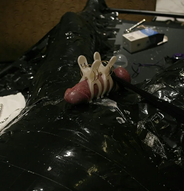 Sexual activity involving application of pain or constriction to the male genitals. This may involve directly painful activities, such as wax play, genital spanking, squeezing, ball-busting, genital flogging, urethral play, tickle torture, erotic electrostimulation or even kicking.